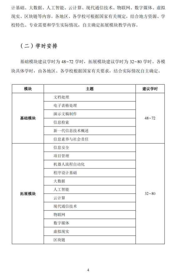 学时安排上,信息技术课程的基础模块建议学时为48~72学时,拓展模块建议学时为32~80学时。各模块具体学时,由各地区、各学校根据国家有关要求,结合实际情况自主确定。