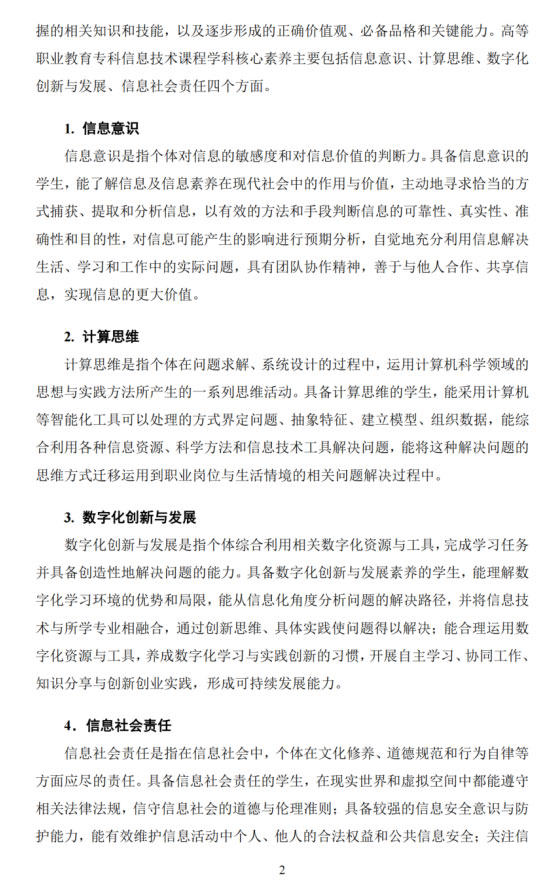 《高等职业教育专科信息技术课程标准(2021年版)》明确,高等职业教育专科信息技术课程是各专业学生必修或限定选修的公共基础课程。其学科核心素养主要包括信息意识、计算思维、数字化创新与发展、信息社会责任四个方面。目标是通过理论知识学习、技能训练和综合应用实践,使高等职业教育专科学生的信息素养和信息技术应用能力得到全面提升。